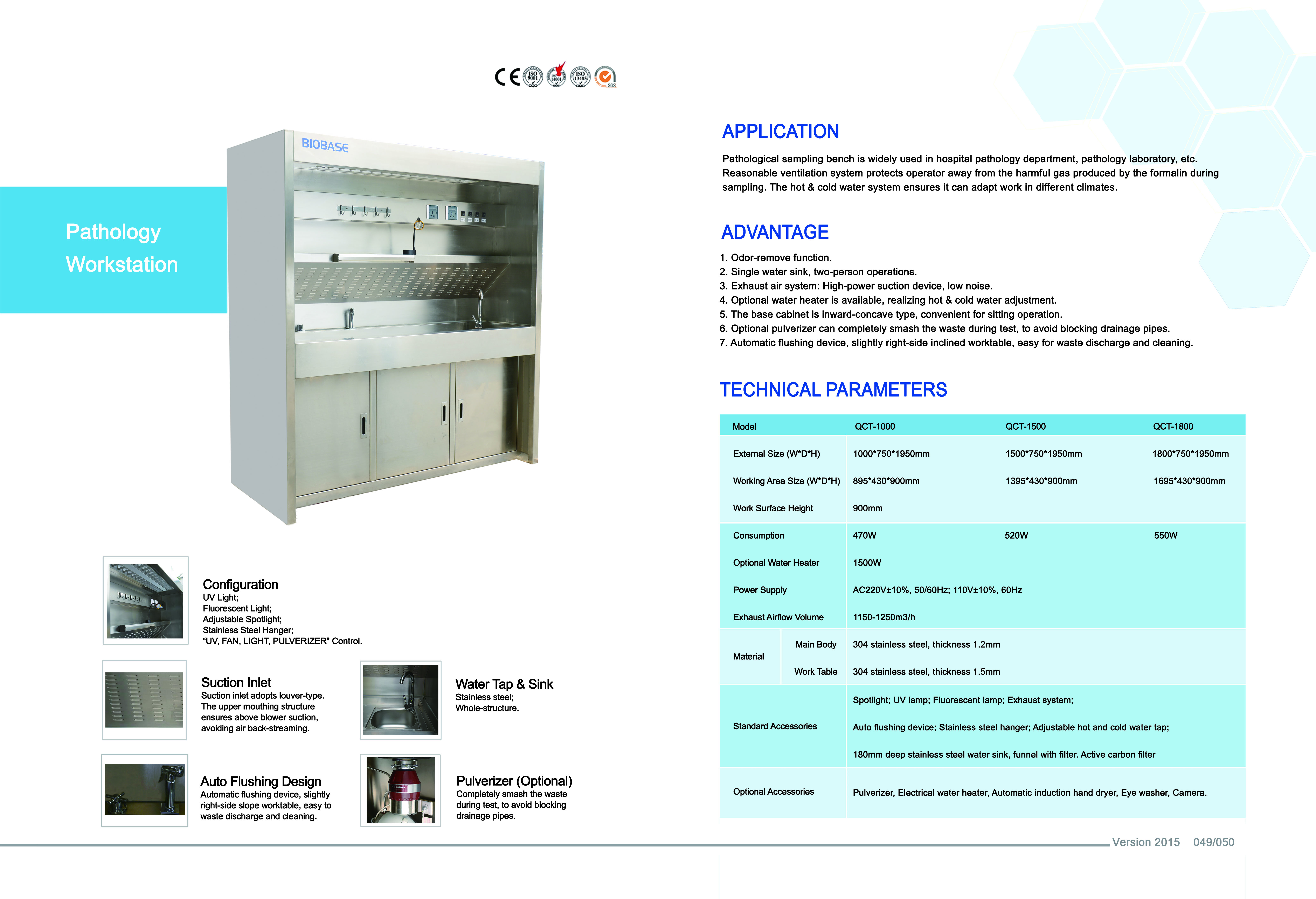 Lámpa; UV lámpa; Fluoreszcens lámpa, Elszívó rendszer, 4 m csővel; Csőpánt,Automata öblítő rendszer; Rozsdamentes acél akasztó, Állítható hideg és melegvízes csap, 180mm mély rozsdamentes acél mosogató, Szűrő, aktív szénszűrő |